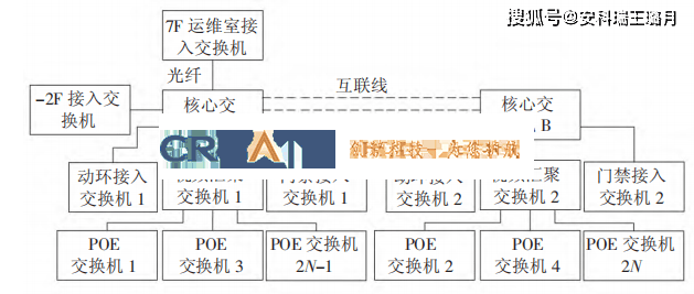 動環(huán)監(jiān)控系統(tǒng)硬件設(shè)備的組網(wǎng)要求A、B雙網(wǎng)運(yùn)行設(shè)備逐級匯接模式,網(wǎng)絡(luò)設(shè)備由POE交換機(jī)、接入交換機(jī)、匯聚交換機(jī)、核心交換機(jī)組成。POE交換機(jī)負(fù)責(zé)視頻攝像機(jī)的供電和數(shù)據(jù)傳輸;接入交換機(jī)使用二層有VLAN功能的交換機(jī),負(fù)責(zé)采集單元中數(shù)據(jù)收斂;匯聚交換機(jī)使用三層交換機(jī),用于匯聚POE交換機(jī)數(shù)據(jù),避免二層網(wǎng)絡(luò)過大導(dǎo)致環(huán)路,也減輕了核心交換機(jī)的數(shù)據(jù)負(fù)擔(dān)。